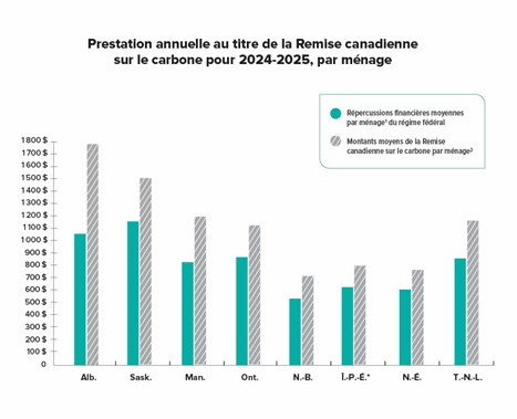 Pour 2024-2025, une famille de quatre recevra les montants de base suivants au titre de la Remise canadienne sur le carbone : 1 800 dollars en Alberta (450 dollars chaque trimestre), 1504 dollars en Saskatchewan (376 dollars chaque trimestre), 1 200 dollars au Manitoba (300 dollars chaque trimestre), 1 120 dollars en Ontario (280 dollars chaque trimestre), 760 dollars au Nouveau-Brunswick (190 dollars chaque trimestre), 824 dollars en Nouvelle-Écosse (206 dollars chaque trimestre), 880 dollars à l’Île-du-Prince-Édouard (220 dollars chaque trimestre) et 1 192 dollars à Terre-Neuve-et-Labrador (298 dollars chaque trimestre).