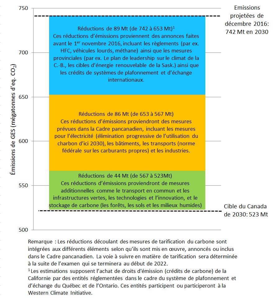 La section supérieure de la barre illustre les réductions d’émissions découlant des mesures annoncées le 1er novembre 2016, notamment celles concernant la réglementation des véhicules lourds, les hydrofluorocarbures et le méthane pour le secteur du pétrole et du gaz. Les mesures provinciales en matière de changements climatiques se reflètent également dans cette section, y compris le Plan de leadership sur le climat de Colombie-Britannique, et les plans de la Saskatchewan visant à accroître les énergies renouvelables aux fins de production d’électricité. Ces mesures devraient permettre de réduire d’ici 2030 les émissions de gaz à effet de serre du Canada à 653 mégatonnes d’émissions équivalentes de dioxyde de carbone, soit une réduction de 89 mégatonnes comparativement aux projections de décembre 2016. Cette barre tient également compte des achats de crédits de carbone de la Californie par des entités réglementées dans le cadre des systèmes de plafond et d’échange du Québec et de l’Ontario, qui sont ou seront liés par le Western Climate Initative.