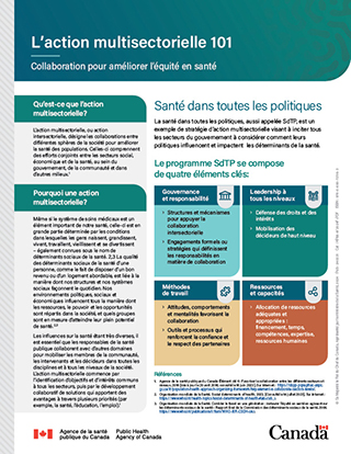 La santé dans toutes les politiques [en anglais seulement], aussi appelée SdTP, est un exemple de stratégie d’action multisectorielle visant à inciter tous les secteurs du gouvernement à considérer comment leurs politiques influencent et impactent les déterminants de la santé. Le programme SdTP se compose de quatre éléments clés.