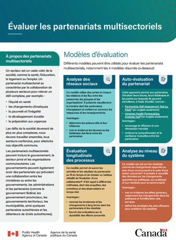Différents modèles peuvent être utilisés pour évaluer les partenariats multisectoriels, notamment les 4 modèles résumés ci-dessous.Note de bas de page 1