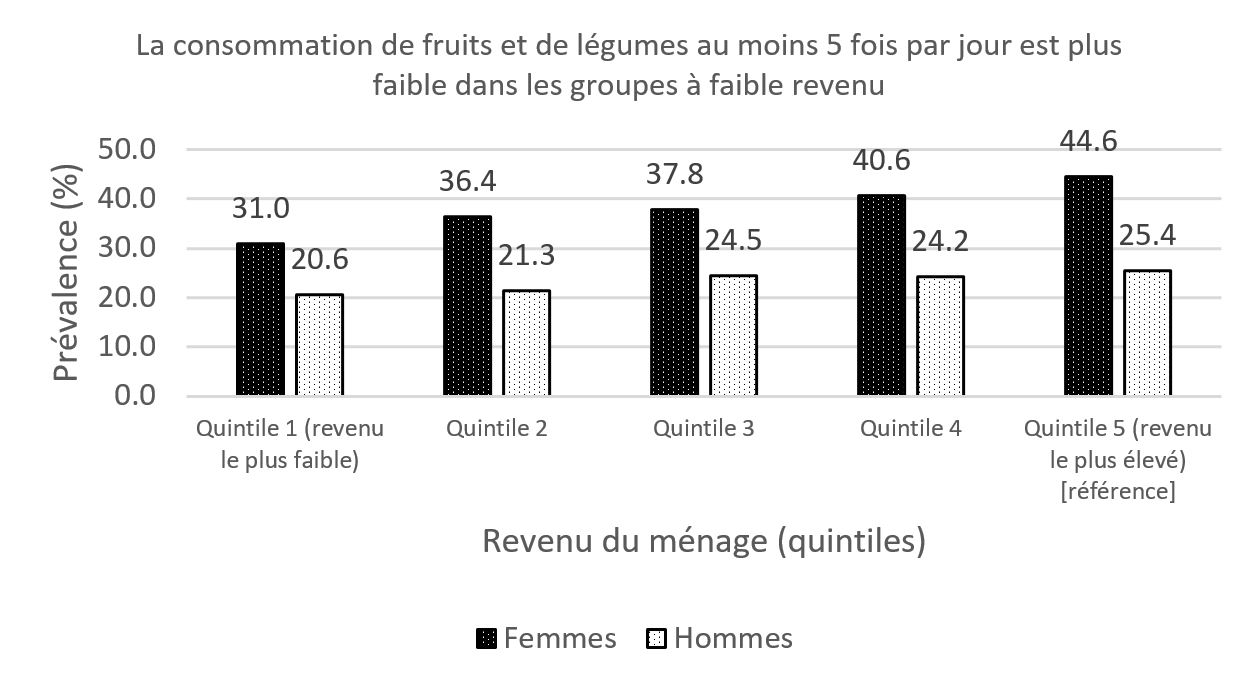 Chez les deux sexes, l’association entre la consommation de fruits et de légumes et le revenu suit un gradient, la consommation de fruits et de légumes étant plus importante dans les groupes au revenu élevé que dans les groupes au revenu faible.
