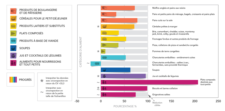 En février 2016, près d'un an avant la date prévue pour l'évaluation complète de l'approvisionnement alimentaire Santé Canada a effectué une surveillance provisoire de la teneur en sodium d'aliments de certaines catégories afin de mesurer la progression de l'industrie vers l'atteinte des cibles de réduction du sodium qu'il a publiées en 2012. Quinze catégories prioritaires d'aliments ont été désignées, en fonction de leur importance par rapport à la consommation de sodium chez la population canadienne :