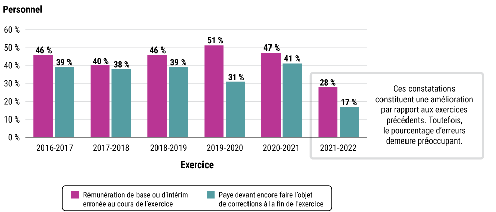 Le diagramme à barres montre, pour chaque exercice de 2016‑2017 à 2021‑2022, le pourcentage du personnel de notre échantillon ayant reçu une rémunération de base ou d’intérim erronée et le pourcentage du personnel dont la paye devait encore faire l’objet de corrections à la fin de l’exercice. Le diagramme montre que le pourcentage du personnel de notre échantillon ayant reçu une rémunération de base ou d’intérim erronée au cours de l’exercice est passé de 46 % en 2016‑2017 à 40 % en 2017‑2018, avant de remonter à 46 % en 2018‑2019 et à 51 % en 2019‑2020. Le pourcentage a ensuite diminué pour s’établir à 47 % en 2020‑2021 et à 28 % en 2021‑2022. Le diagramme montre aussi que le pourcentage du personnel de notre échantillon dont la paye devait encore faire l’objet de corrections à la fin de l’exercice est demeuré stable à 38 % ou 39 % pendant les trois exercices de 2016‑2017 à 2018‑2019, et qu’il a reculé pour se fixer à 31 % en 2019‑2020. Le pourcentage a ensuite grimpé à 41 % en 2020‑2021, avant de tomber à 17 % en 2021‑2022.