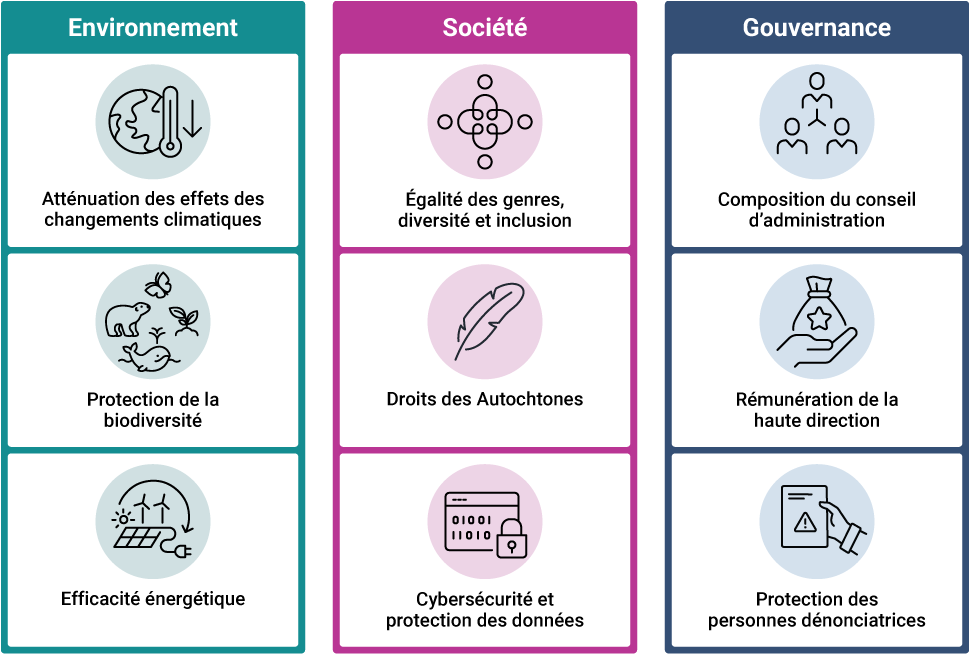 Voici quelques exemples de facteurs à considérer au moment d’évaluer le rendement des organisations en ce qui a trait aux questions touchant l’environnement, la société et la gouvernance.