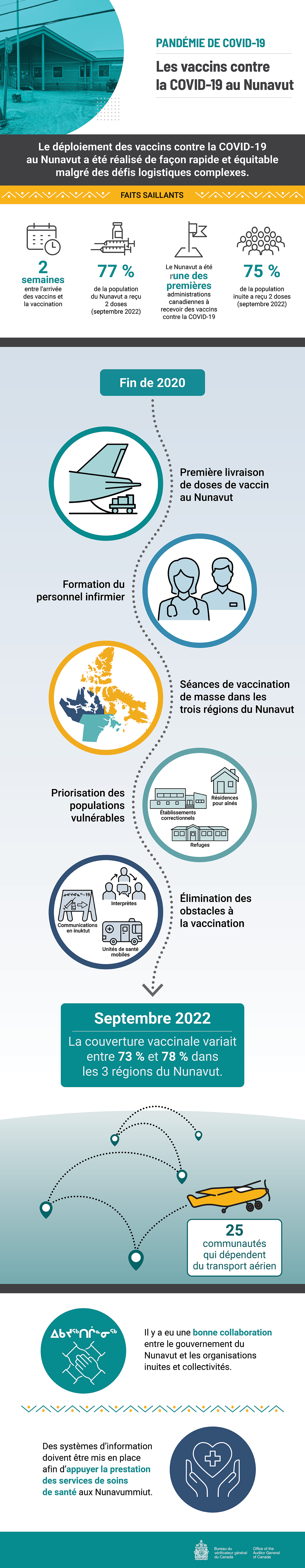 Le déploiement des vaccins s’appuyait sur un petit nombre de membres du personnel de la santé ainsi que d’employées et d’employés des régions et du territoire dont le travail avait été facilité par leur connaissance du contexte unique du Nunavut. Toutefois, leurs efforts avaient été compliqués par l’absence d’un plan d’intervention en cas de pandémie, qui aurait pu orienter leurs efforts en matière de vaccination, et par l’inefficacité des systèmes de suivi et de rapports. Par exemple, comme il ne disposait pas de système de gestion des stocks, le Ministère n’avait pas pu suivre la trace de plus de 19 500 doses de vaccins (soit 16 % des doses). Ainsi, le taux de gaspillage de 15 % des doses totales de vaccins que le Ministère avait signalé est vraisemblablement inexact : ce taux pourrait en fait dépasser le double de ce qui a été déclaré. Le gouvernement du Nunavut doit répondre aux problèmes liés à ses systèmes d’information, notamment en ce qui a trait à la gestion des stocks, afin d’améliorer la prestation des services de soins de santé, de réduire le fardeau sur une main-d’œuvre surchargée et de renforcer ses plans d’intervention dans l’éventualité d’autres pandémies et campagnes d’immunisation de masse.