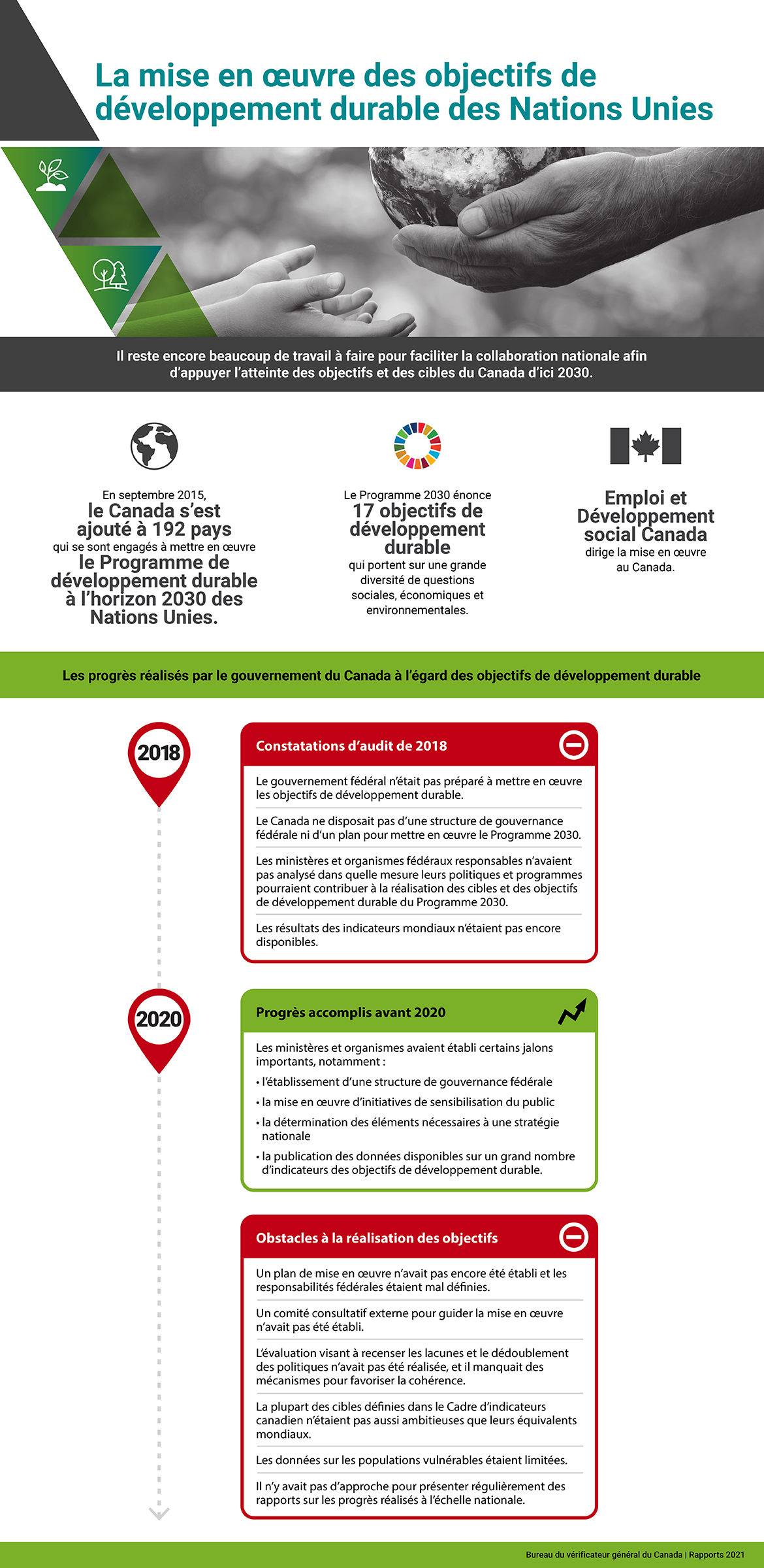 - Depuis notre rapport en 2018, les ministères et organismes avaient pris certaines mesures visant à établir une démarche nationale pour la mise en œuvre du Programme de développement durable à l’horizon 2030 des Nations Unies et l’atteinte des objectifs de développement durable.
