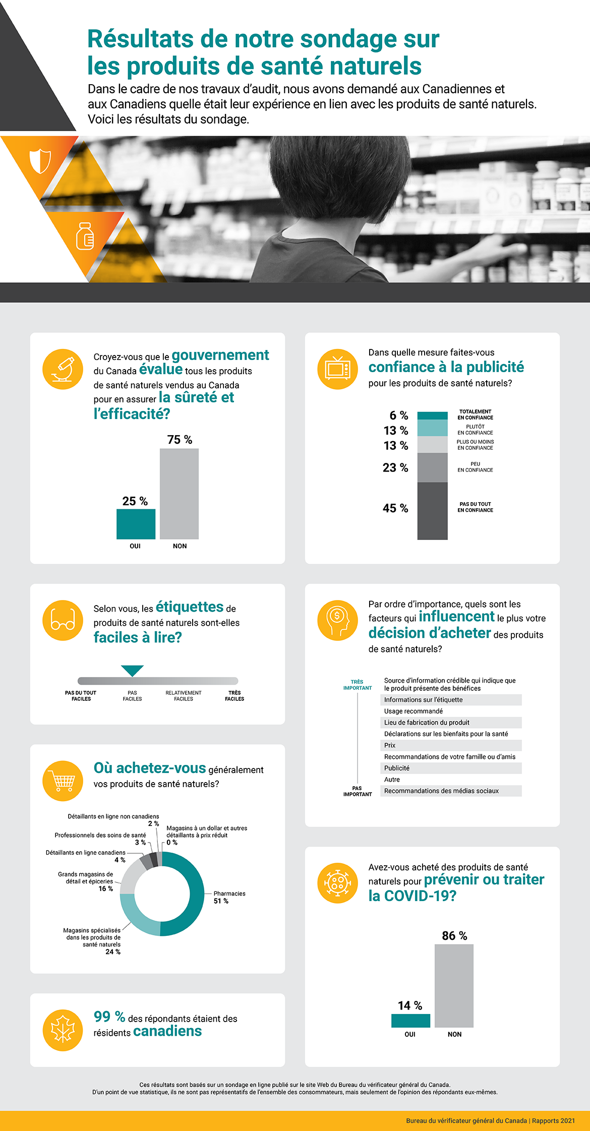 Cette infographie illustre les résultats d’un sondage sur les produits de santé naturels. Dans le cadre de nos travaux d’audit, nous avons demandé aux Canadiennes et aux Canadiens quelle était leur expérience en lien avec les produits de santé naturels. Ces travaux d’audit concernaient le rapport 2, « Les produits de santé naturels — Santé Canada », des rapports du commissaire à l’environnement et au développement durable de 2021.
