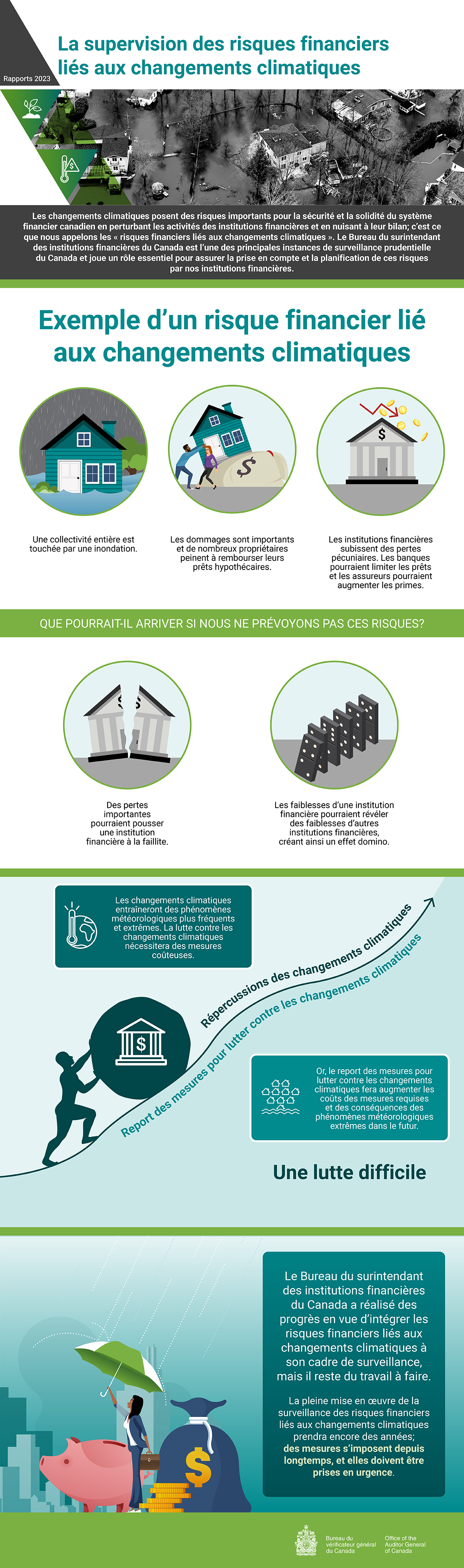 - La façon dont les principaux risques financiers liés aux changements climatiques seront intégrés au cadre de surveillance actualisé du BSIF demeure incertaine. Si ces risques ne sont pas suffisamment mis en évidence, ils pourraient ne pas être pleinement pris en compte en temps opportun.