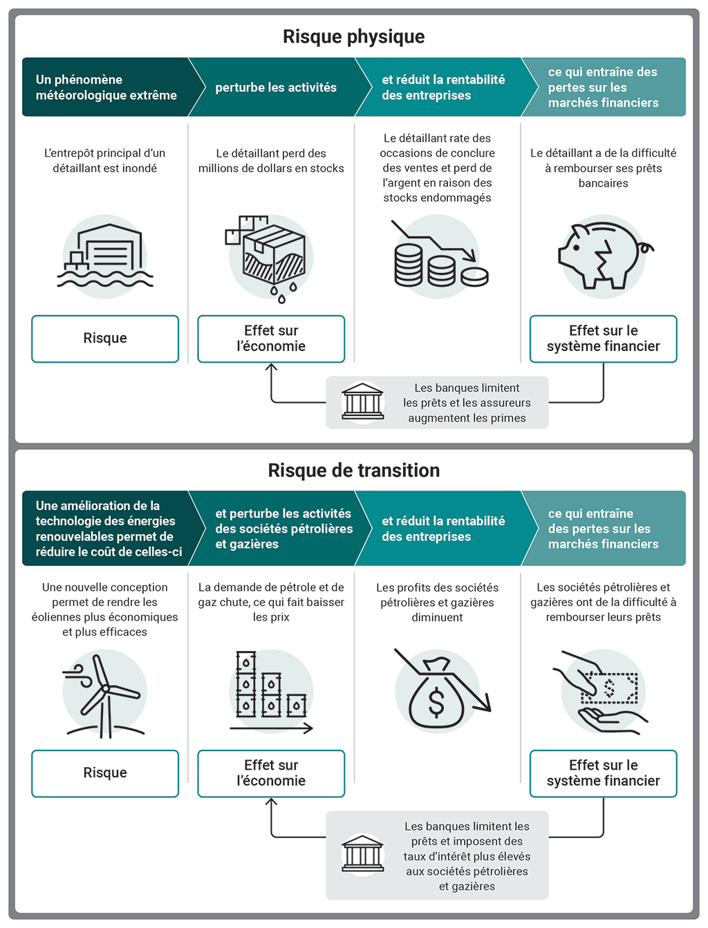 La pièce donne des exemples de la façon dont un risque physique, comme une inondation, et un risque de transition, comme un changement technologique, peuvent avoir une incidence sur l’économie et le système financier. Les risques physiques et les risques de transition sont deux types de risques financiers liés aux changements climatiques.