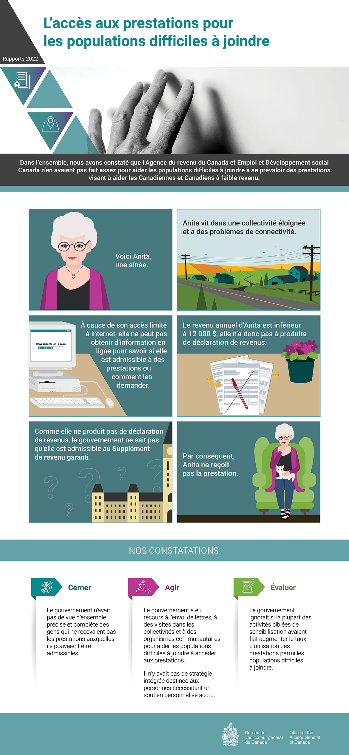 Dans l’ensemble, nous avons constaté que l’Agence du revenu du Canada et Emploi et Développement social Canada n’en avaient pas fait assez pour aider les populations difficiles à joindre à se prévaloir des prestations visant à aider les Canadiennes et Canadiens à faible revenu.