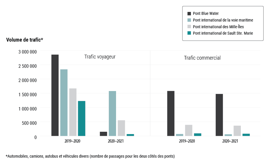 Au cours de l’exercice 2019‑2020, le volume de trafic voyageur sur le pont international de Sault Ste. Marie était de 1 226 044 passages, volume qui a nettement diminué à 65 963 passages en 2020‑2021. Le volume de trafic commercial de ce pont était de 90 143 passages en 2019‑2020, volume qui a diminué à 76 765 en 2020‑2021.
