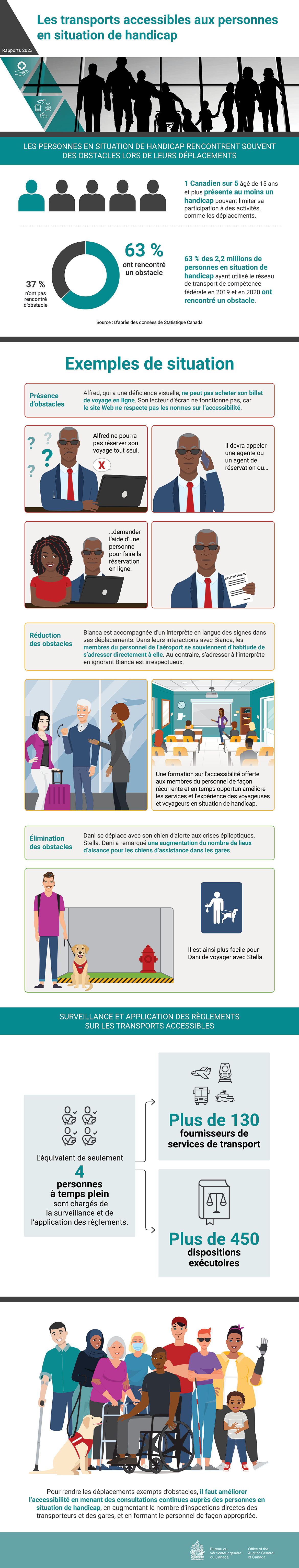 - Dans le cadre de son rôle de surveillance, l’Office des transports du Canada disposait d’un nombre insuffisant d’outils et de responsables de l’application de la loi pour éliminer tous les obstacles. Seulement 4 membres du personnel équivalents temps plein à l’Office étaient responsables de la surveillance de plus de 130 fournisseurs de services de transport et de l’application du Règlement sur les transports accessibles aux personnes handicapées, qui comporte plus de 450 dispositions exécutoires. L’Office examinait la conception des services, conformément aux règlements, et non la prestation réelle de ceux‑ci.