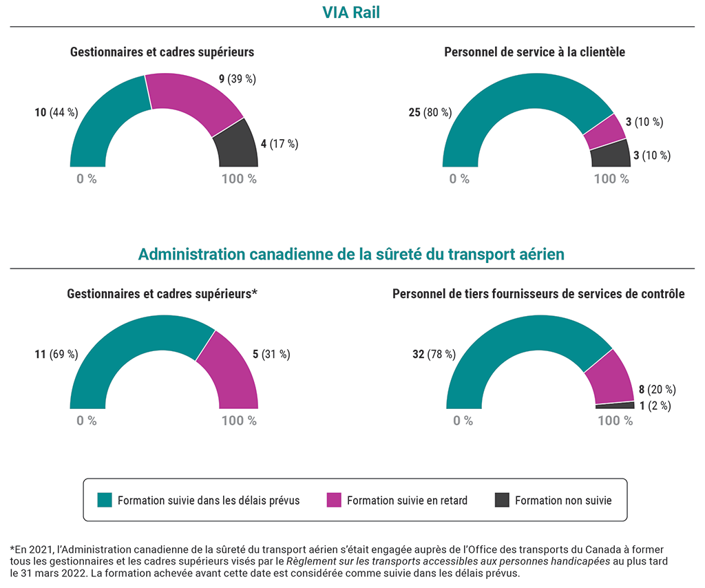 Ces 4 diagrammes à secteurs en demi‑cercle montrent le nombre de membres du personnel de gestion et d’autres membres du personnel de VIA Rail et de l’Administration canadienne de la sûreté du transport aérien qui avaient suivi la formation sur l’accessibilité dans les délais prévus, qui l’avaient suivie en retard, ou qui ne l’avaient pas suivie.