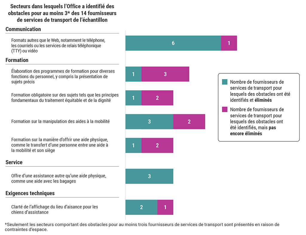 - Le deuxième type d’obstacles relevé dans ce secteur était la formation obligatoire sur des sujets tels que les principes fondamentaux du traitement équitable et de la dignité. Cet obstacle a été relevé et éliminé pour 1 fournisseur de services de transport, mais il a été relevé et pas encore éliminé pour 2 autres fournisseurs de services de transport.