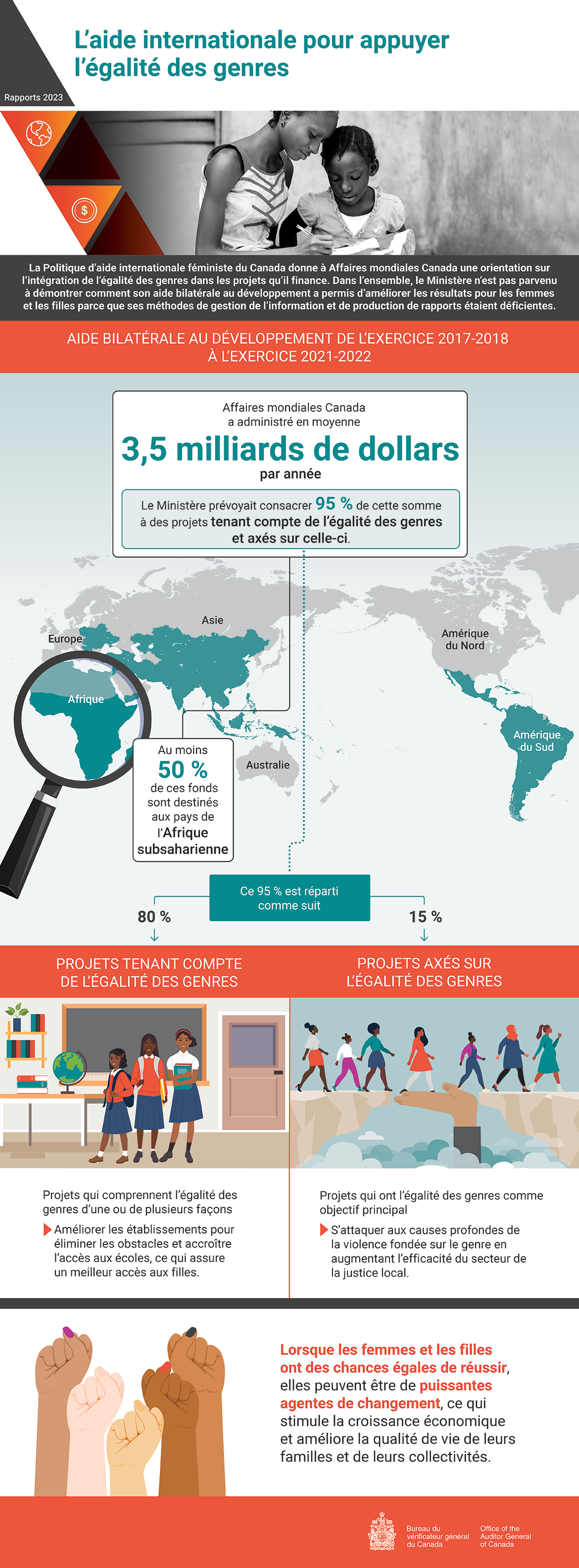 Dans l’ensemble, Affaires mondiales Canada n’est pas parvenu à démontrer comment l’aide bilatérale au développement totalisant environ 3,5 milliards de dollars qu’il accorde chaque année aux pays à faible revenu et à revenu intermédiaire a permis d’améliorer les résultats pour les femmes et les filles. Lorsque les femmes et les filles ont des chances égales de réussir, elles peuvent être de puissantes agentes de changement, ce qui stimule la croissance économique et améliore la qualité de vie de leurs familles et de leurs collectivités.