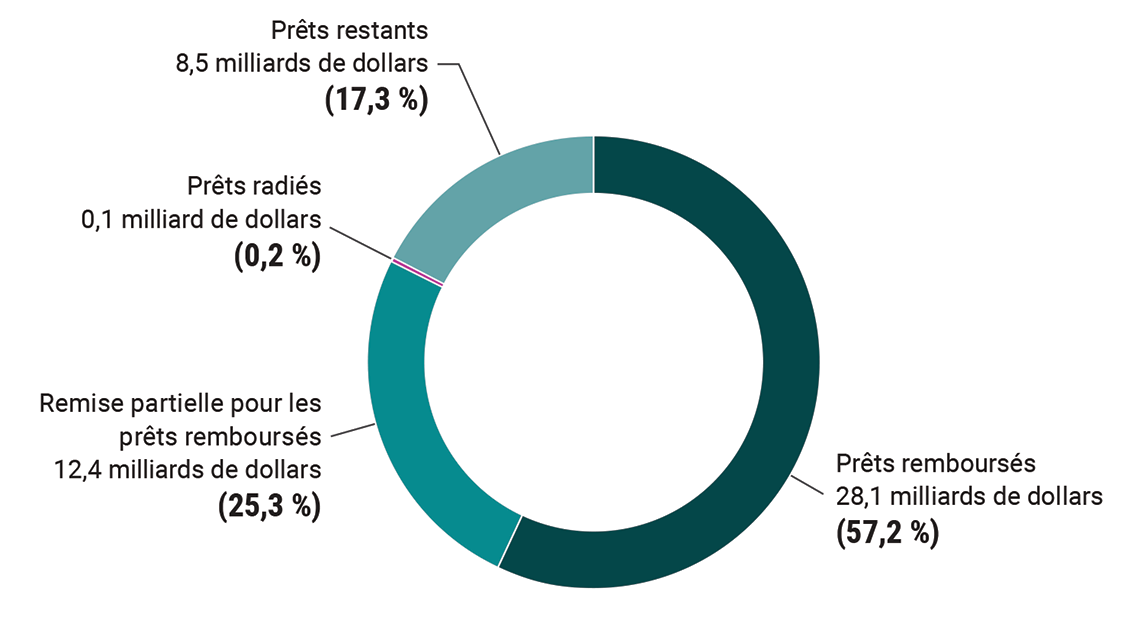 Ce diagramme à anneau illustre l’état des prêts accordés au titre du Compte d’urgence pour les entreprises canadiennes. En ordre décroissant, voici l’état des prêts : les prêts remboursés totalisaient 28,1 milliards de dollars, ou 57,2 % de tous les prêts accordés; le montant de la remise partielle pour les prêts remboursés était de 12,4 milliards de dollars, ou 25,3 % des prêts; les prêts radiés totalisaient 0,1 milliard de dollars, ou 0,2 % des prêts; et les prêts restants totalisaient 8,5 milliards de dollars, ou 17,3 % des prêts.