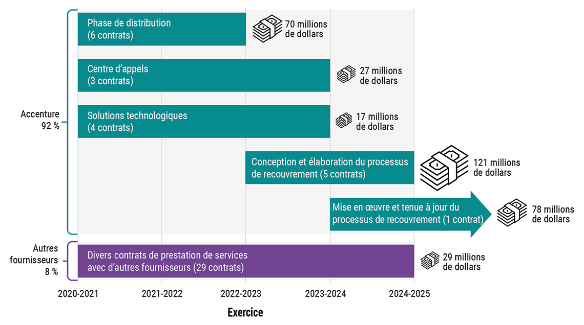 Les contrats suivants ont été accordés à Accenture. De l’exercice 2020‑2021 à l’exercice 2022‑2023, 6 contrats totalisant 70 millions de dollars ont été accordés durant la phase de distribution. De 2020‑2021 à 2023‑2024, 3 contrats totalisant 70 millions de dollars ont été accordés au centre d’appels et 4 contrats totalisant 17 millions de dollars ont été accordés pour les solutions technologiques. De 2022‑2023 à 2024‑2025, 5 contrats totalisant 121 millions de dollars ont été accordés pour la conception et l’élaboration du processus de recouvrement. Un contrat totalisant 78 millions de dollars a été accordé pour la mise en œuvre et la tenue à jour du processus de recouvrement. Ce contrat est en cours.