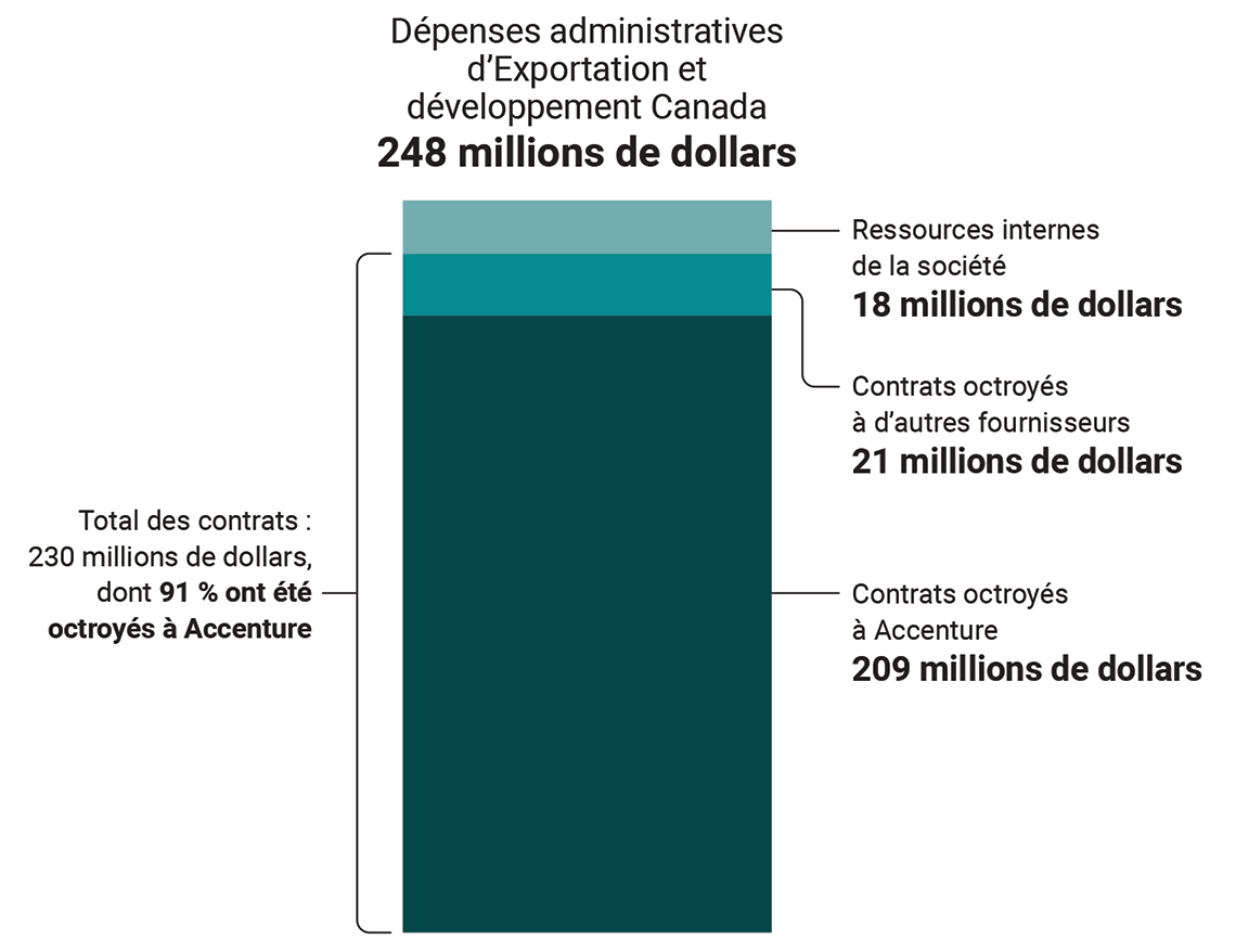 - Au 31 mars 2024, la majorité des dépenses d’Exportation et développement Canada (230 millions de dollars) étaient liées à des contrats avec des fournisseurs tiers, et 91 % de ces dépenses consistaient en des paiements à Accenture dans le cadre de contrats non concurrentiels. En raison du recours aux systèmes exclusifs d’Accenture, l’exécution continue du programme dépendra de ces contrats non concurrentiels au moins jusqu’en 2028.