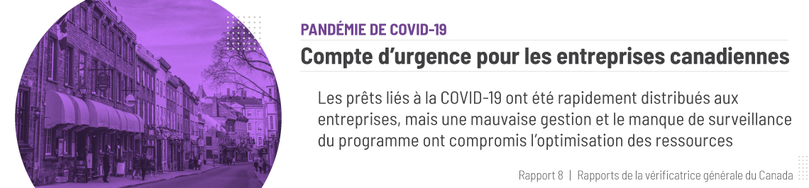 Exportation et développement Canada, en tant que société d’État responsable de l’exécution du programme du Compte d’urgence pour les entreprises canadiennes, a agi rapidement pour accorder aux petites entreprises 49,1 milliards de dollars en prêts afin de couvrir les dépenses qui ne pouvaient pas être reportées pendant la pandémie de COVID‑19. Sur ces prêts, 91 % ont été consentis à des entreprises admissibles. Au 31 mars 2024, environ 83 % du total des prêts accordés à l’origine avaient été remboursés; et une partie de ces prêts avaient fait l’objet d’une remise. D’après nos travaux d’audit, nous avons estimé qu’environ 3,5 milliards de dollars avaient été versés à des bénéficiaires inadmissibles.