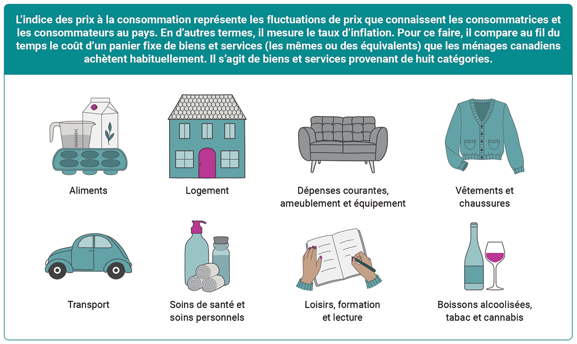L’indice des prix à la consommation représente les fluctuations de prix que connaissent les consommatrices et les consommateurs au pays. En d’autres termes, il mesure le taux d’inflation. Pour ce faire, il compare au fil du temps le coût d’un panier fixe de biens et services (les mêmes ou des équivalents) que les ménages canadiens achètent habituellement. Il s’agit de biens et services provenant de huit catégories.