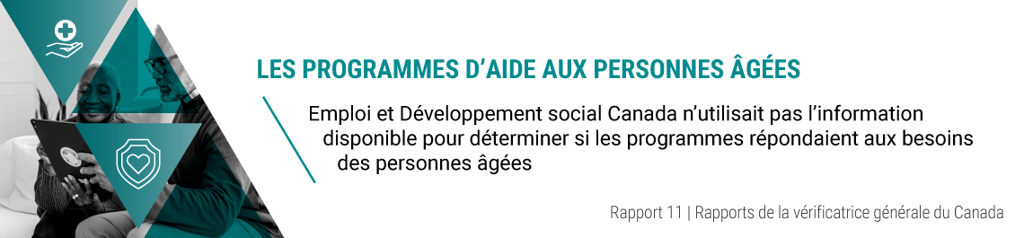 En 2018, Emploi et Développement social Canada a été chargé d’assister la ministre des Aînés dans l’exécution de son mandat, qui est d’aider le gouvernement fédéral à mieux comprendre les besoins des personnes âgées et de s’assurer que des programmes et des services sont en place pour répondre à ces besoins. Dans l’ensemble, nous avons constaté que le Ministère n’avait pas de tableau complet des problèmes rencontrés par les personnes âgées ou des programmes en place au pays pour servir ces personnes. Par conséquent, il ne pouvait pas dire si les programmes fédéraux en place étaient suffisants pour répondre aux besoins actuels des personnes âgées ni s’ils seraient suffisants à l’avenir.