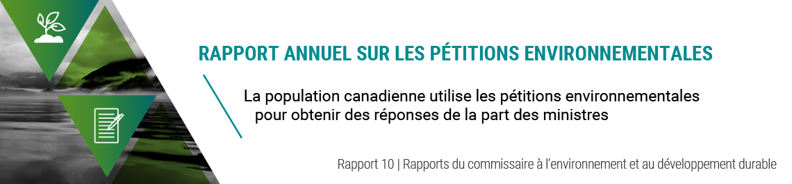 Les pétitions environnementales constituent un moyen unique pour les personnes qui résident au Canada de transmettre — en leur nom ou au nom d’une organisation — leurs questions et préoccupations concernant l’environnement et le développement durable aux ministres fédéraux concernés, et d’être assurées d’obtenir des réponses de leur part. Le commissaire à l’environnement et au développement durable assure la gestion du processus de pétitions environnementales au nom de la vérificatrice générale du Canada.